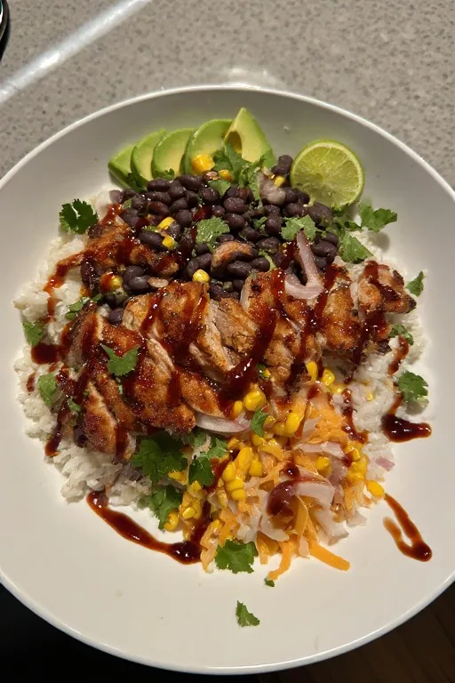 • Assemble bowls — rice base, BBQ chicken, beans, corn, avocado, cheese, red onion, cilantro, sour cream, BBQ drizzle, and lime.