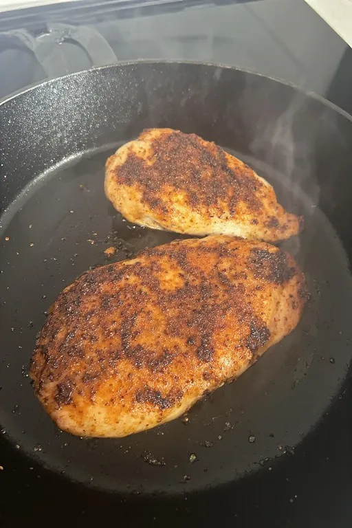 • Sear marinated chicken in hot cast iron 5–6 minutes per side until 165°F. Rest 5 minutes then slice.