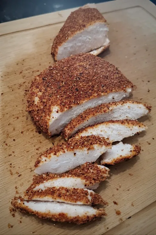 After resting, slice against the grain into strips or dice into chunks — either works, personal preference. The deep reddish-brown spiced exterior against the juicy white interior is exactly what you want to see. If it’s not juicy inside, you either skipped the rest or overcooked it. The rest is what makes all the difference.
