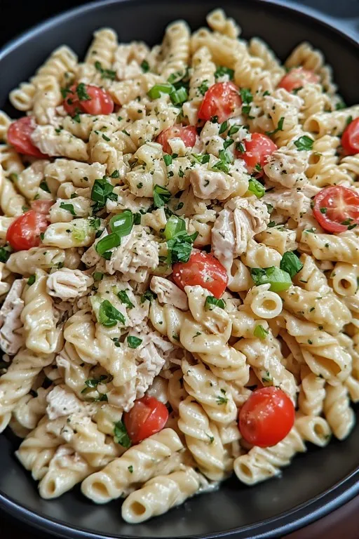 Make this on Sunday and lunch is handled Monday through Thursday. The chicken stays moist in the creamy dressing, the pasta holds its texture, and the vegetables stay crisp enough through day three. Reserve about ¼ of the dressing separately and stir a spoonful into each portion before eating — keeps everything fresh and properly coated all week.