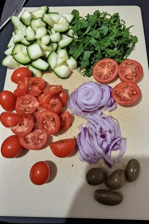 - Dice cucumber, halve tomatoes and olives, slice red onion, chop peppers and herbs.