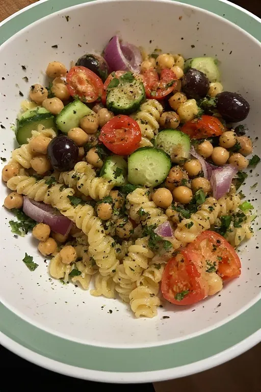 Q: Is Greek pasta salad healthy? Very — chickpeas add protein and fiber, feta adds calcium, fresh vegetables add vitamins, and olive oil provides healthy fats. A genuinely nutritious meal that doesn’t taste like diet food.