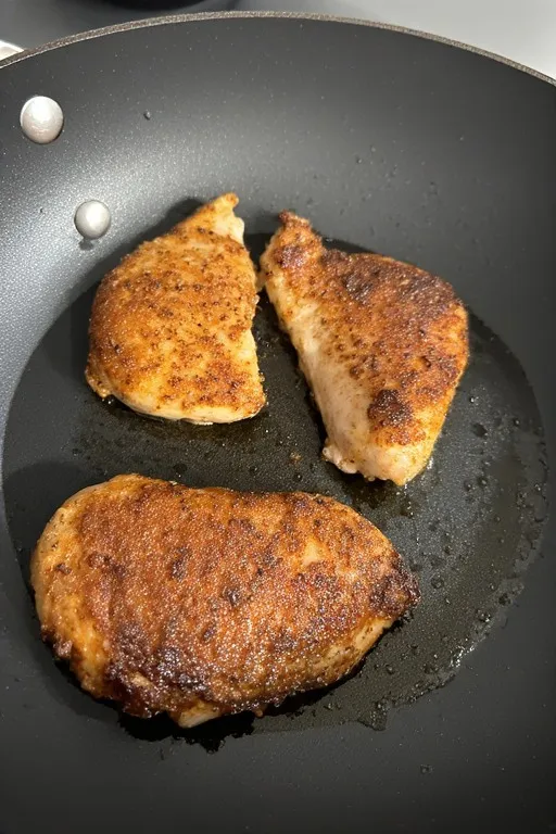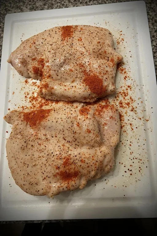 Pound chicken to an even ¾ inch thickness. Season both sides generously with garlic powder, smoked paprika, salt, and pepper. Even thickness is the single most important step — it ensures the chicken cooks through evenly and you don’t end up with dry edges and an undercooked center. Two minutes of effort here saves you from a frustrating result later.