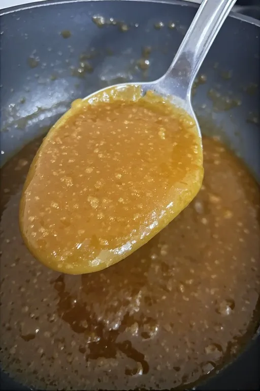 Let the sauce simmer and reduce for 2–3 minutes, stirring occasionally, until it thickens slightly and coats the back of a spoon. It should look glossy and syrupy — not watery. The smell at this stage is genuinely one of the best things about making this recipe. That sweet, caramelized, garlicky aroma filling the kitchen is hard to beat.