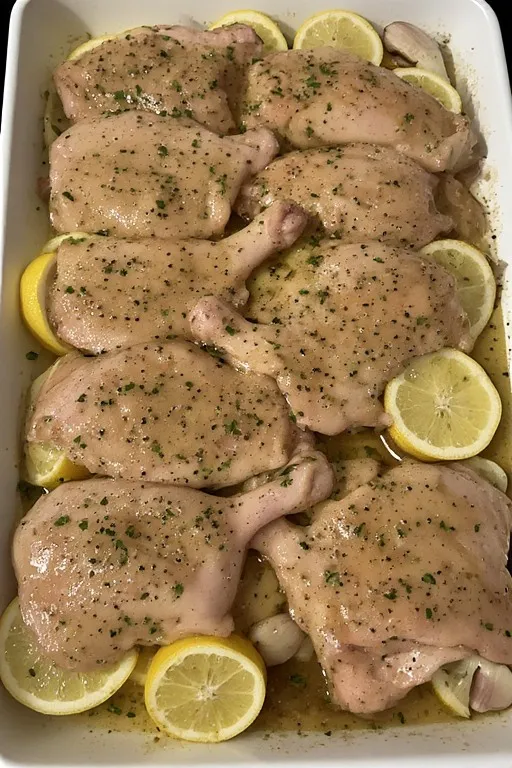 Preheat oven to 400°F. Lightly coat a baking dish with olive oil. Arrange thin lemon slices across the bottom of the dish — the chicken bakes directly on top of them. The lemon slices infuse flavor into the bottom of the chicken as it bakes and they look really beautiful when the dish comes out of the oven.