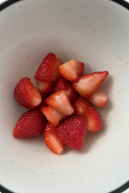 Dice the fresh strawberries and toss them with honey, lemon juice, and lemon zest in a small bowl. Let them sit for at least 10 minutes — the honey draws out the natural juices and the strawberries become slightly jammy and intensely flavored. This step takes 2 minutes and makes the strawberry topping taste significantly better than just plain diced fruit. The smell of those strawberries with lemon and honey is genuinely wonderful.